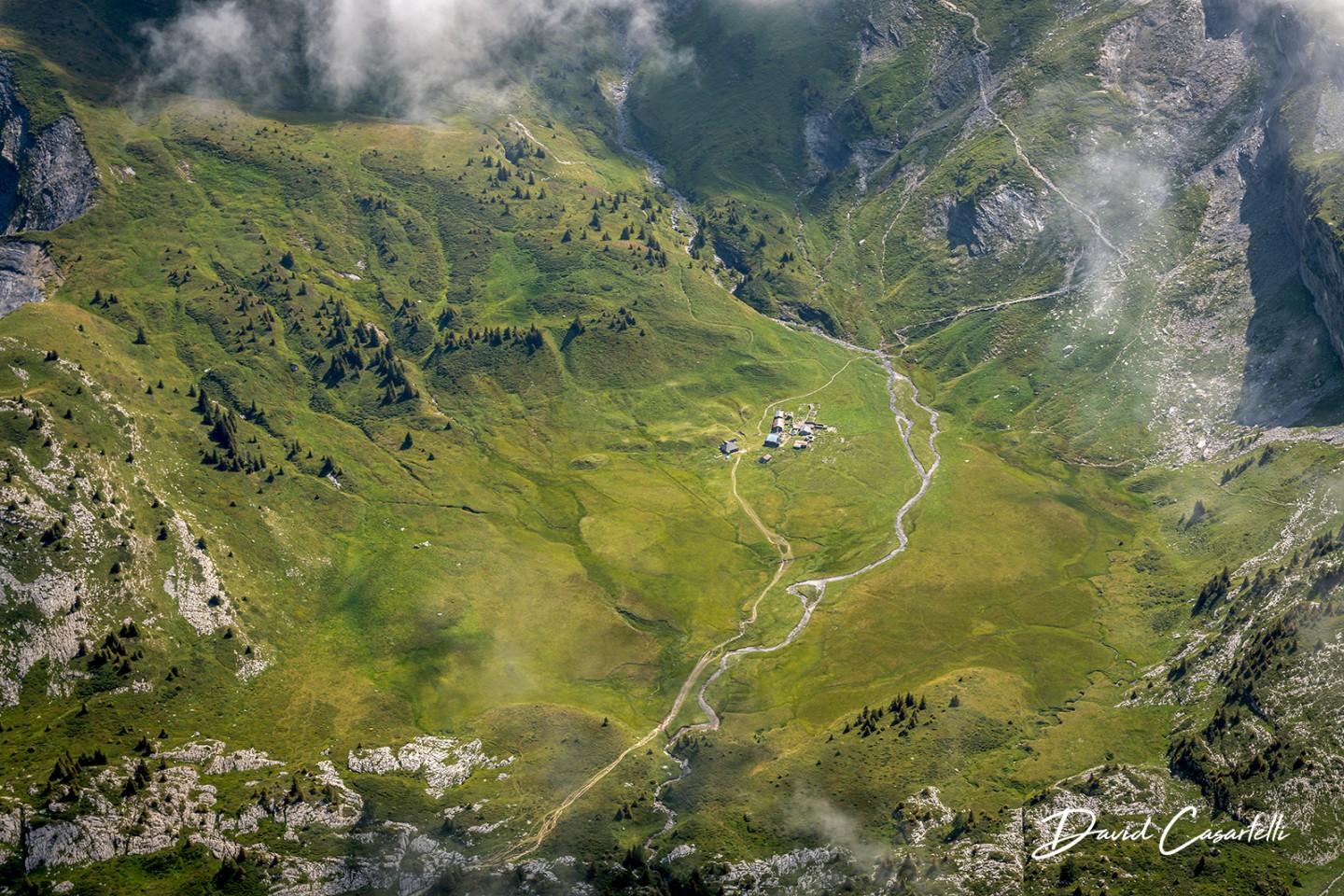 Du sommet, le regard plonge vers l’alpage, écrin de verdure ou serpente la vie pastorale sous le ciel d’altitude.