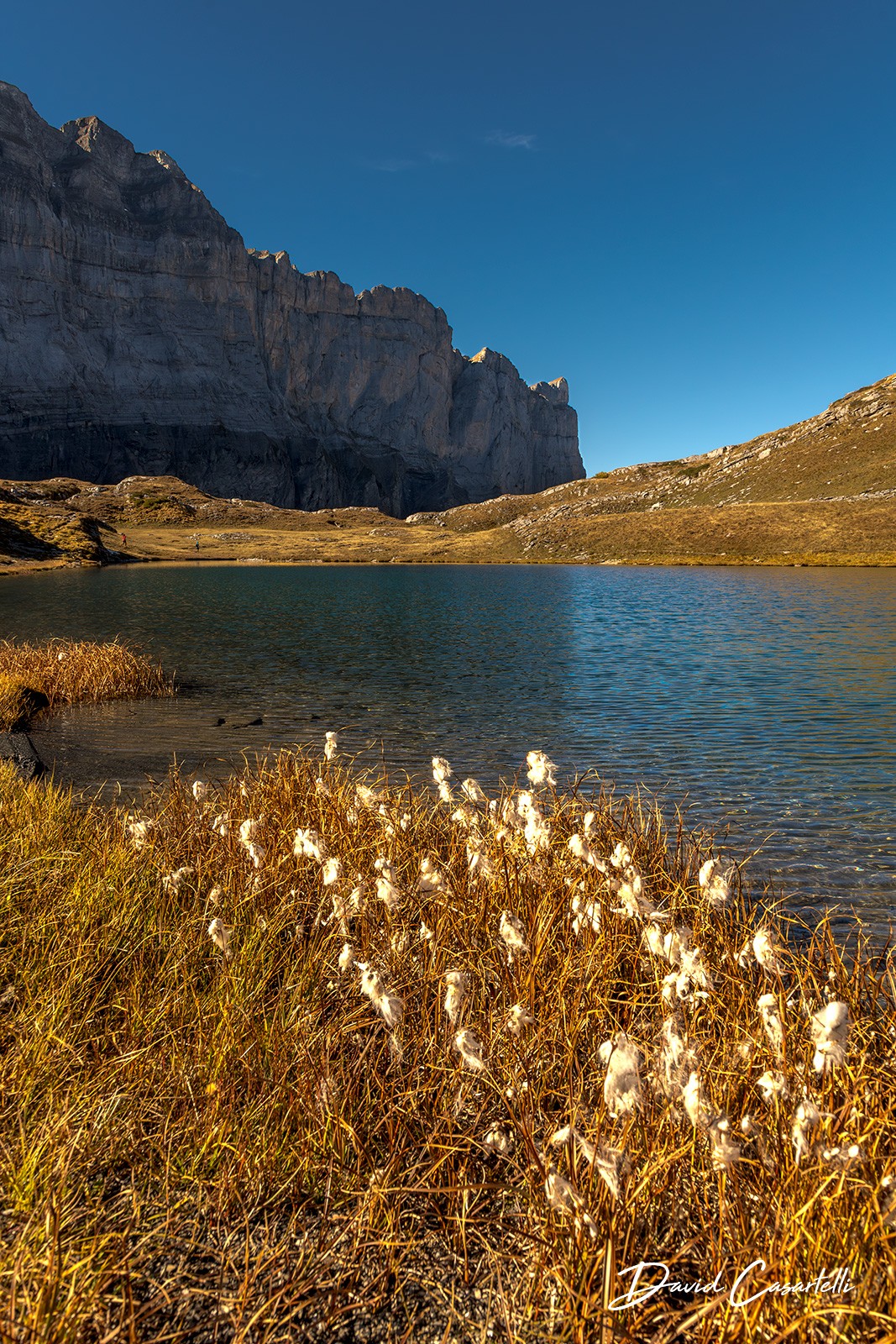 Au bord du lac d’Anterne, les linaigrettes s’animent sous le vent. Face à elles, les Fiz dressent leurs dentelles minérales