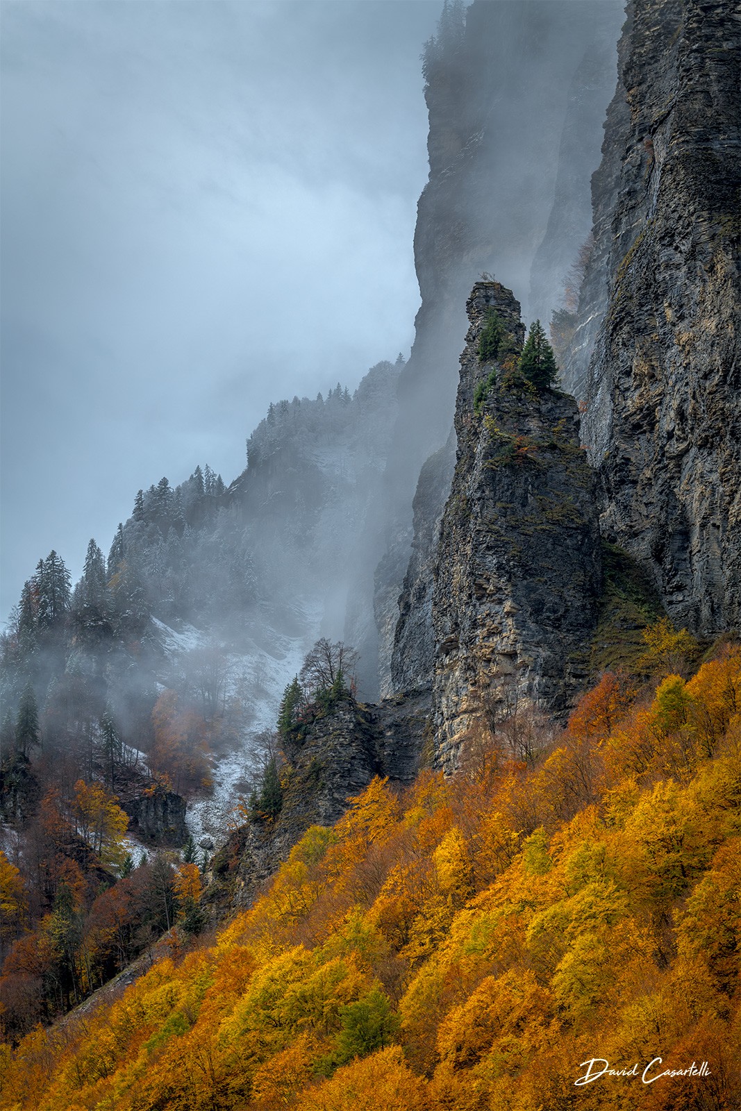 Le Gardien, c’est la rencontre entre la puissance et la sérénité, entre la verticalité brute de la montagne et la douceur des couleurs d’automne. Un hommage à ces instants suspendus où la nature nous rappelle sa force et sa grâce.