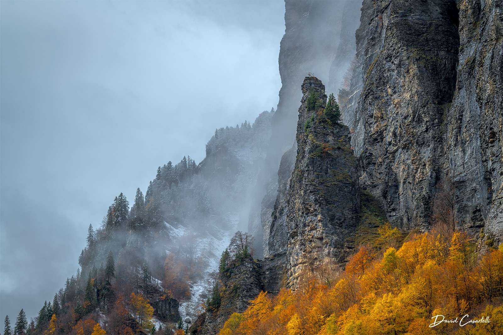 La brume dévoile par instants sa silhouette, gardienne silencieuse des saisons qui se croisent.
