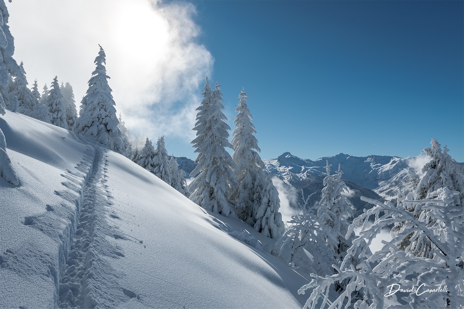 Une trace s’élève, solitaire, comme une signature sur le grand livre blanc de l’hiver. Le silence est roi, seul le crissement feutré de la neige accompagne l’ascension. Chaque pas est un battement de cœur, chaque arbre givré, un veilleur immobile. Là-haut, la lumière perce les nuages comme une promesse de liberté. Cette image est une ode à ceux qui cherchent l’invisible, à ceux qui gravissent pour ressentir, à ceux qui savent que les plus beaux chemins sont ceux que l’on crée soi-même.
